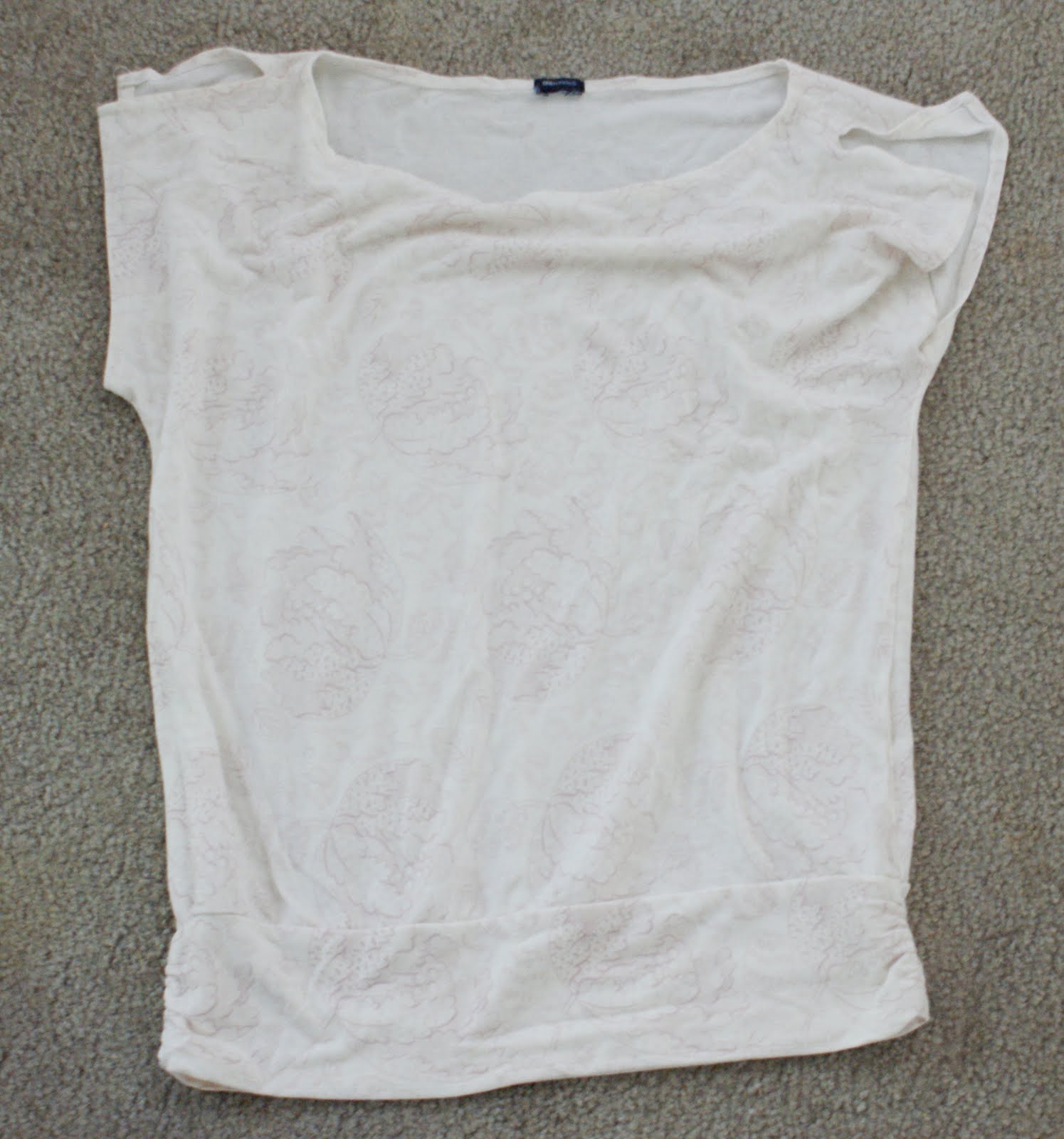 So I have this old Gap top from oh… early college… maybe high school… I love it. It’s lightweight and it has a fun print and it goes with both my pink pants and my maroon pants. But there’s one problem… its predominately cream colored. Normally that’s not a problem. But for the duration of twin nursing… it’s a problem. (Seriously, can the designers of nursing bras make one bra that doesn’t have polka dots that will fit me?! I get it… they’re trying to make these functional bras hip and cool and what not. But what we really want is a seamless nude colored bra with maybe a touch of lace. Are you listening nursing bra companies that make bras in my size? )